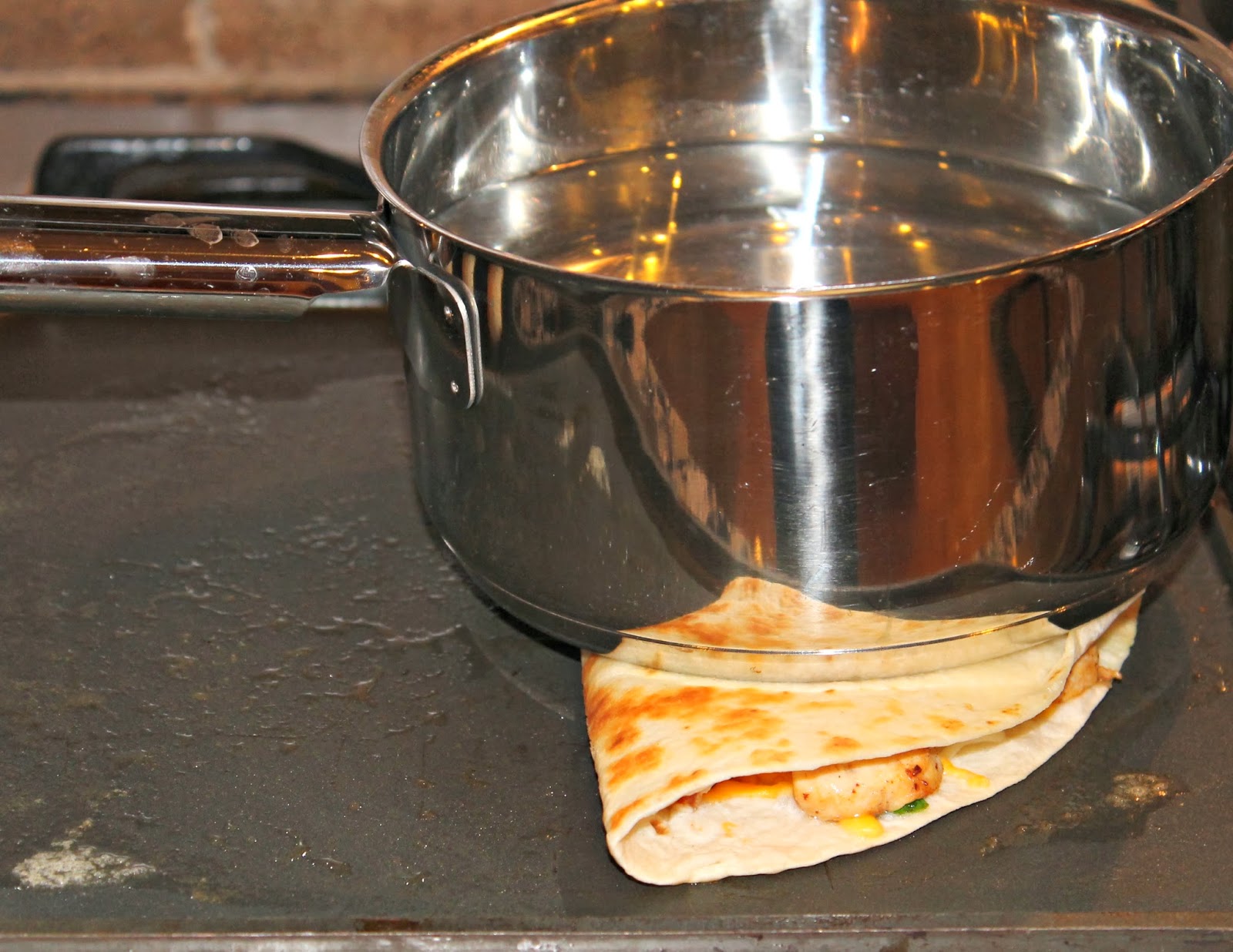 Here's a little trick I have for making quesadillas and also for making panini's and grilled cheeses.  I fill a small/medium saucepan with water and place it on top while cooking to press it together so the cheese gets super melty and it will hold together better.