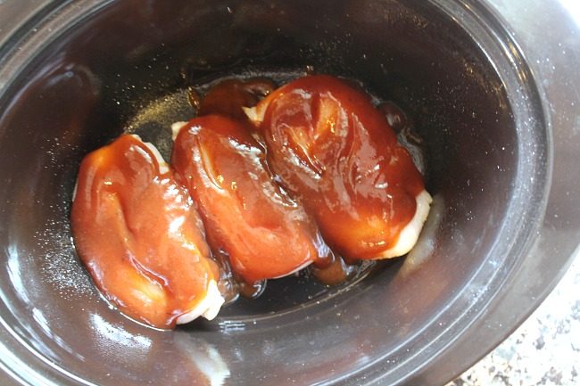 - Place chicken in slow cooker. Pour BBQ sauce over chicken and season with garlic powder. Set slow cooker to high for 2 hours or low for 4 hours.