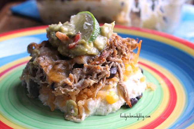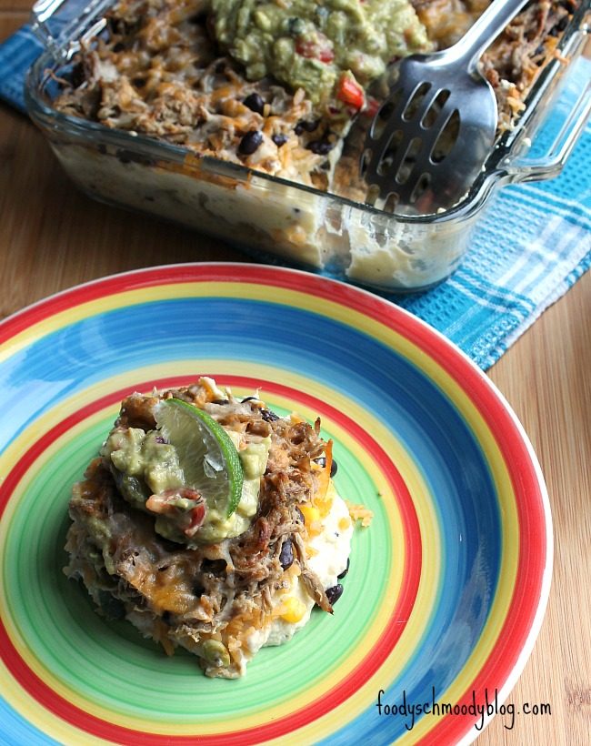 So I went ahead and made a quick and easy cheater guacamole by mixing avocados, tomato, onion and lime juice with some of the Fire Roasted Green Salsa. I just plopped it right on top of the whole casserole. Voila! Gosh, I love a shortcut!