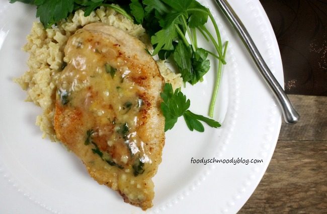 Pretty simple, I started off with some thin boneless chicken breasts and dredged them in a mixture of flour, cornstarch, salt and pepper. I added 1 T olive oil and 2 T I Can't Believe It's Not Butter® (original variety). I cooked the chicken until it was browned nicely and cooked through and then moved that over to a platter. Then I returned the same skillet (why dirty another one when there is lots of flavor left in this one) to the stove and added some more I Can't Believe It's Not Butter® with a little garlic. Okay, a lot of garlic. Then, I hit it with some wine and broth and then added a little bit of a broth and flour mixture to thicken it up a bit. I let that cook up until it was thick and delicious and then finished it off with some parsley, lemon zest and lemon juice. I spooned my buttery garlic sauce over the chicken and served it over creamy rice. I may have even spooned a little extra sauce on the rice too! Maybe.