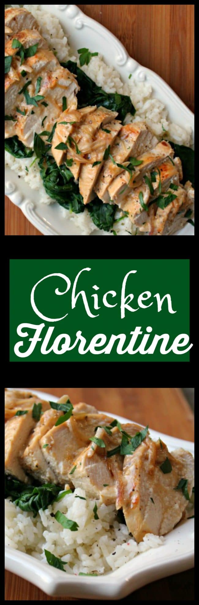 Chicken Florentine - Boneless chicken breasts are browned then served atop a bed of rice and spinach, all topped with a flavorful white wine, shallot, cream sauce.