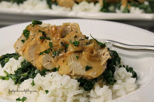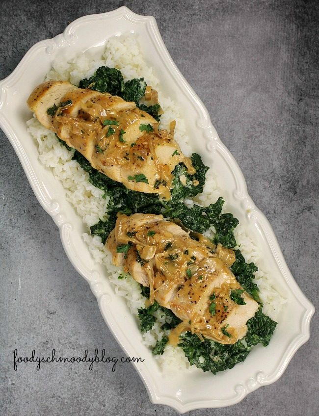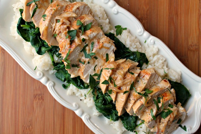 To serve : Place cooked rice on platter, top with spinach. Slice each piece of chicken on the bias (at an angle) and place atop the spinach. Pour sauce over chicken. Sprinkle additional parsley over the top if desired.