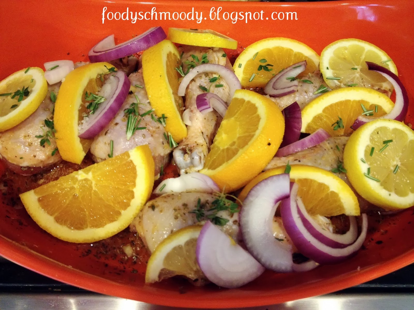 - Arrange chicken in a 9x13 baking dish, pour seasoning mixture over everything and toss chicken around in it to coat. Be sure to turn chicken thick skin side up when finished. Arrange onion, lemon slices and orange slices around and on chicken. Sprinkle the fresh herbs over everything.