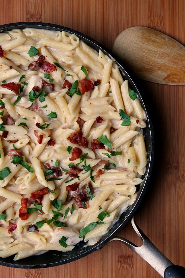 • Add drained pasta to skillet (if skillet is not large enough then return pasta back to its cooking pan and pour the sauce in with pasta) over medium low. Stir well. Add chicken and most of the bacon into the pasta mixture (reserving just a few pieces, if desired, to garnish serving plates). Cook just 2-3 minutes more to warm chicken, if needed.