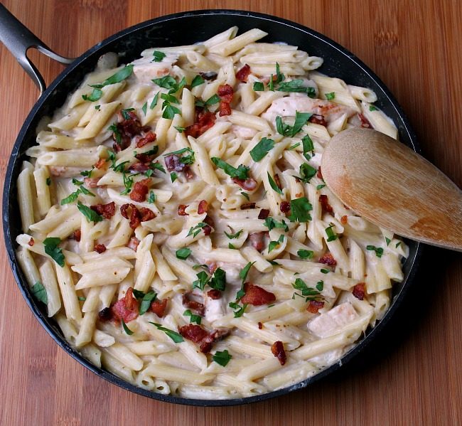 Creamy Garlic Pasta with Bacon and Chicken is perfect for busy week nights.  Using rotisserie chicken or pre-cooked chicken makes this dish even easier.  Or leave the chicken out altogether!