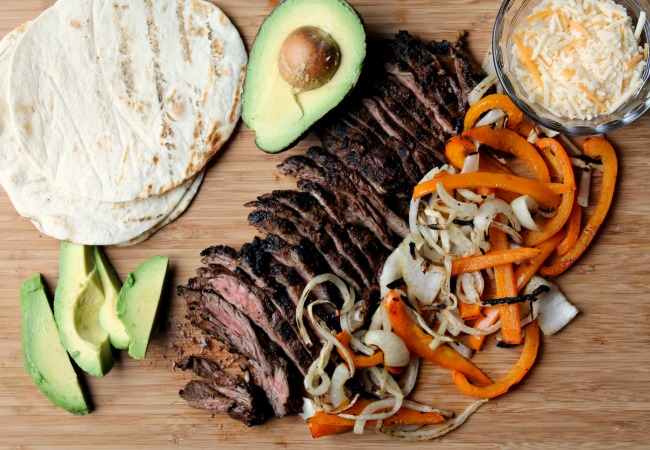 To serve my steak fajitas, I like a rustic look. I place the sliced skirt steak on a cutting board or large platter and place all the toppings around it. Everyone can custom build their fajitas.