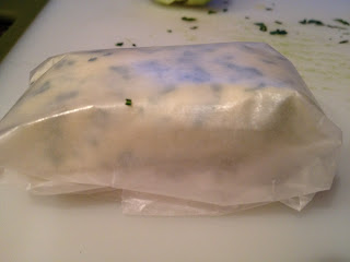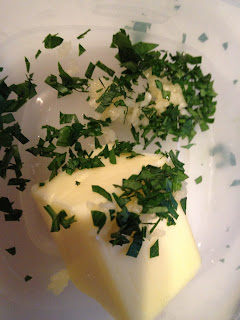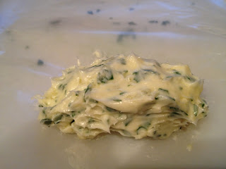 Combine the herbs and garlic with the butter.  I use a rubber spatula to smoosh it all together.  Once combined well, form a log of it on either plastic wrap or wax paper and put in the fridge for a half hour.