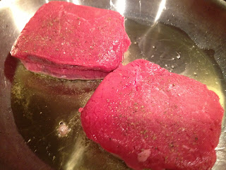 Filet Mignon, what a great cut of meat to cook when it's not convenient to grill outside.  I generally buy steaks like Porterhouse and Ribeye but I will only grill those.  So when the weather is not cooperating for outdoor cooking, I will get filets and cook them indoors without having to smoke out the entire house or worry about too much oil splatter etc.