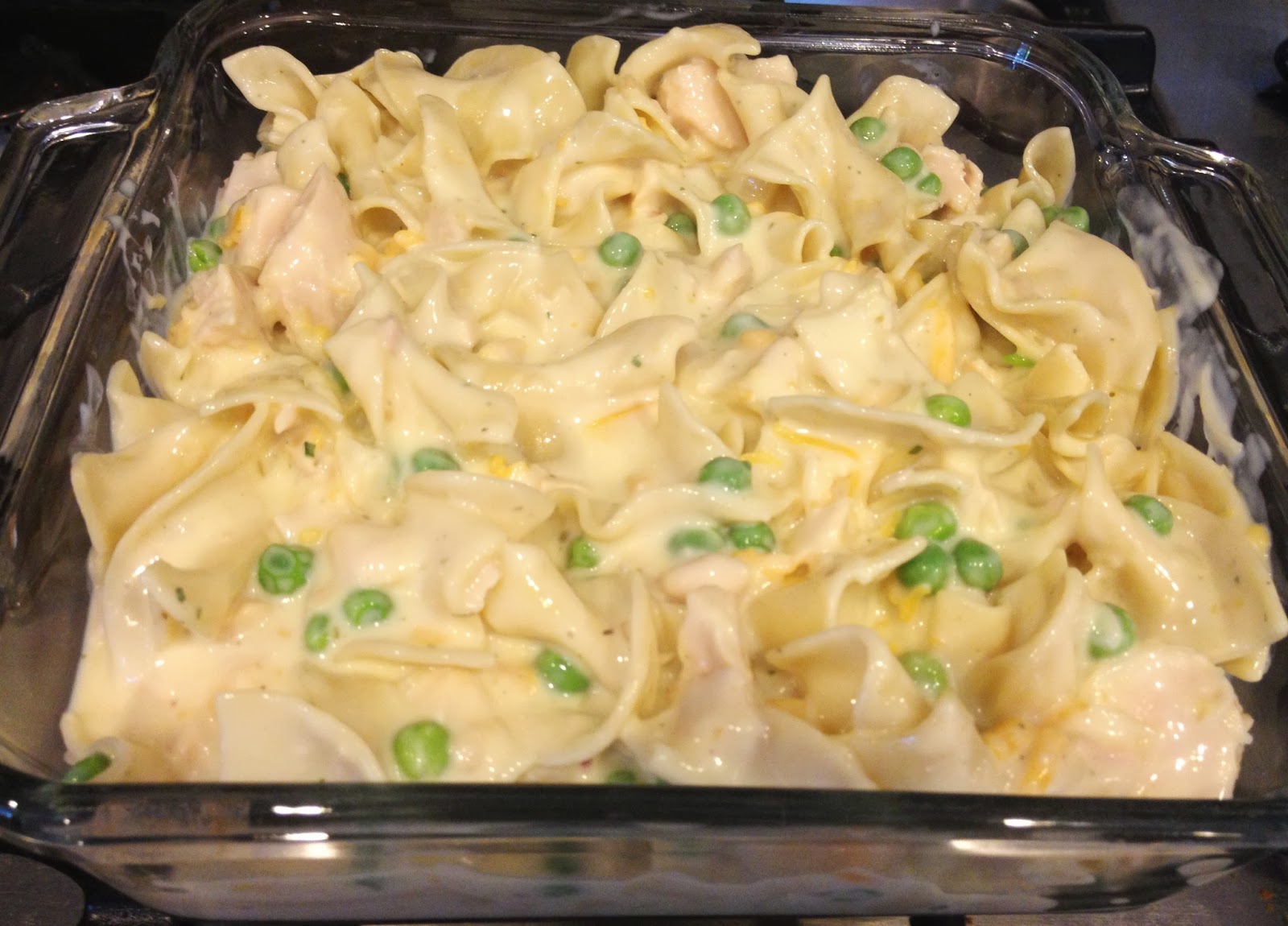 3. Meanwhile in a large bowl combine cream of chicken soup, sour cream, milk, cheese and seasonings. Fold in chicken, then peas and finally noodles.