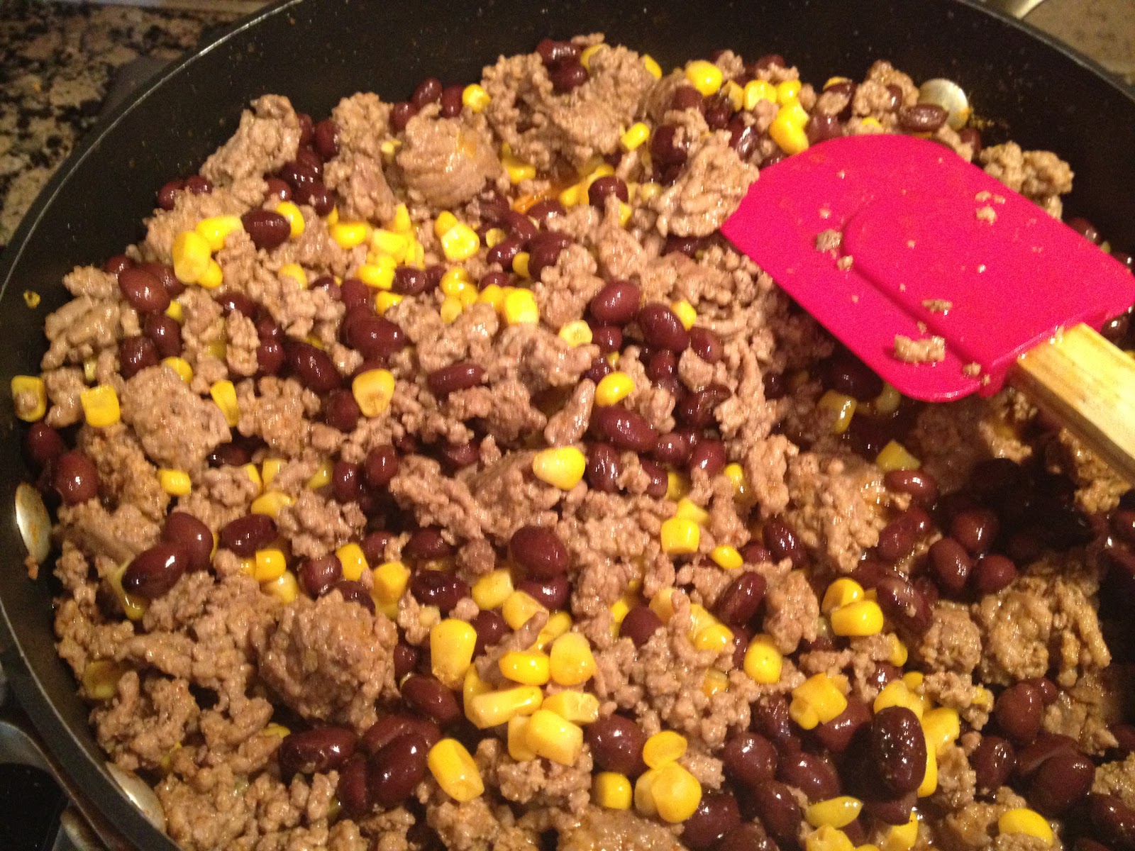 Cook your meat until no longer pink, drain grease and return to pan. {While your meat is cooking prepare potatoes.} Add taco seasoning and half the amount of water called for on the seasoning packet, cook for a few minutes on medium heat until sauce starts to thicken. Add corn, beans and salsa and stir together until well incorporated.