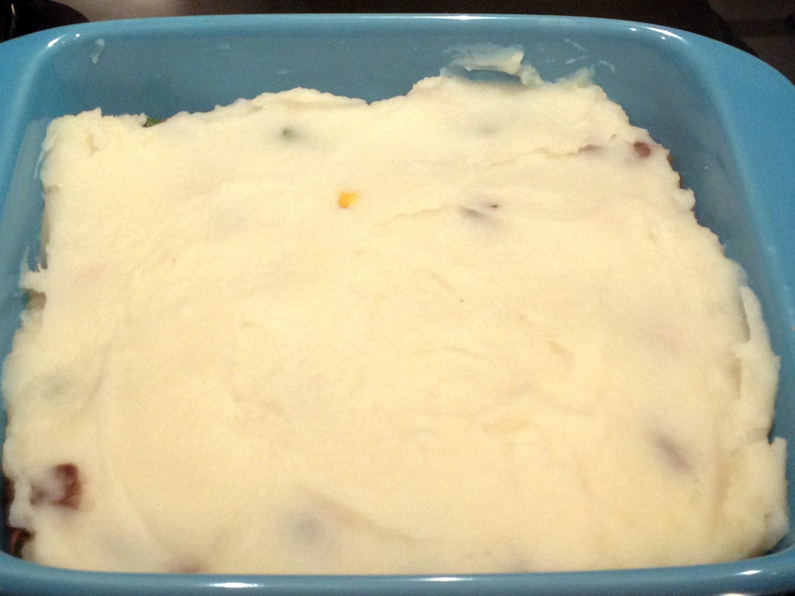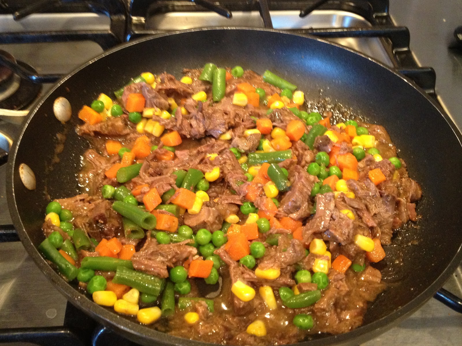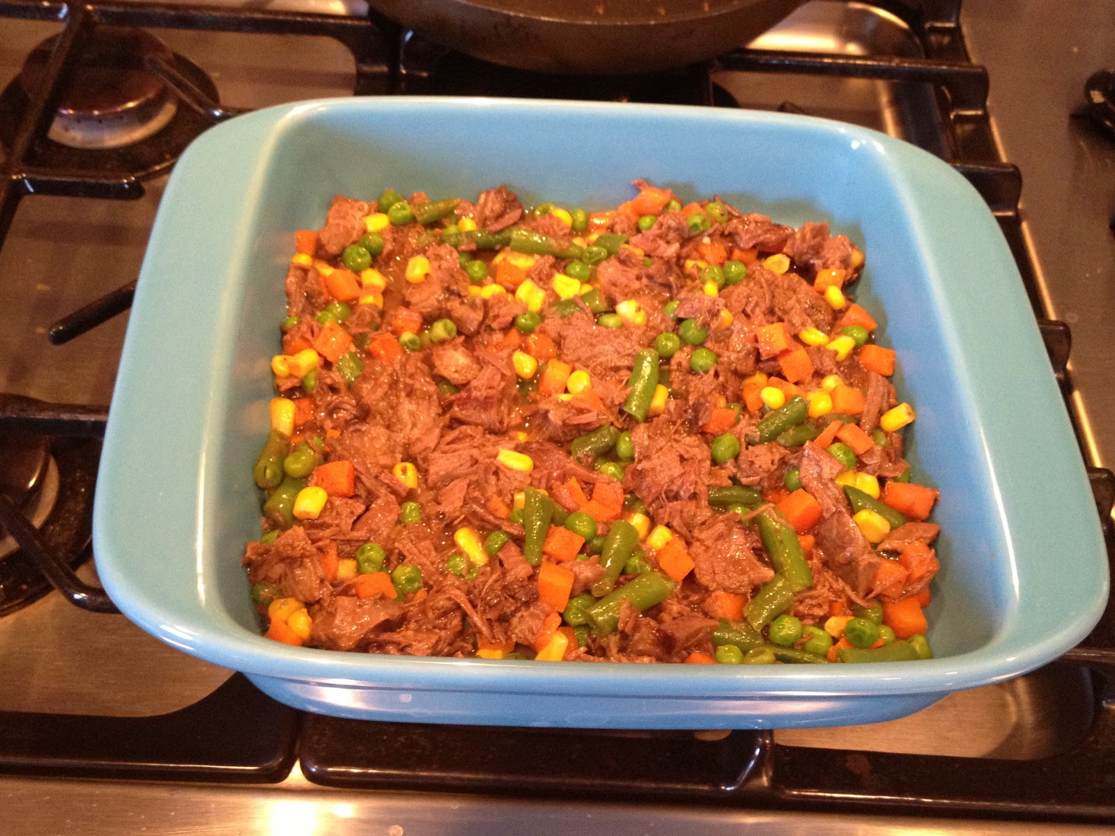 Heat 1 T butter in large saute pan. Add chopped pot roast and gravy. Cook about 5 minutes until heated through. Add meat and gravy to bottom of a 9x9 casserole dish. Top with vegetables and then top that with mashed potato. Bake 350 for 20 minutes and gravy is bubbling up.