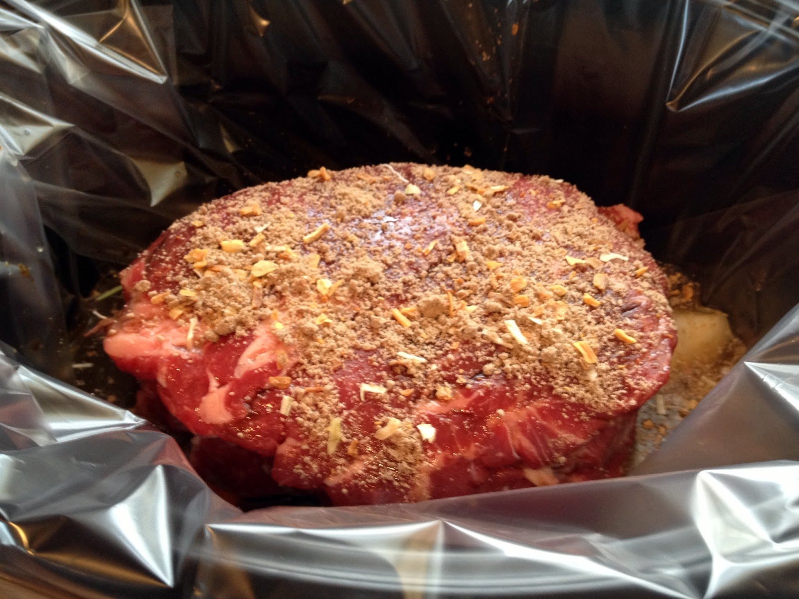 1 pot roast (bottom round etc. something appropriate for slow cooking)