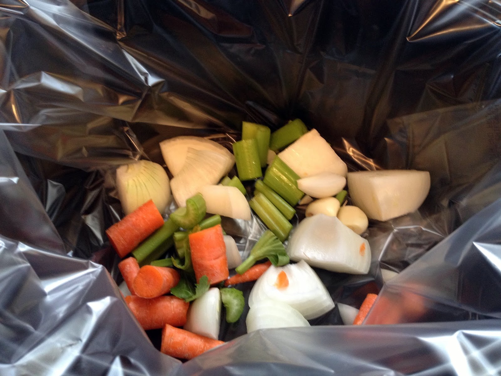 Add vegetables to bottom of a lined crock pot (slow cooker). Add half the onion soup seasoning to vegetables.Top with thyme bundle. Then top with roast. Pour the broth/stock over roast and then sprinkle the remaining soup mix over roast. Cover and cook on low 6-8 hours until super tender.