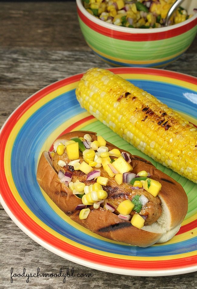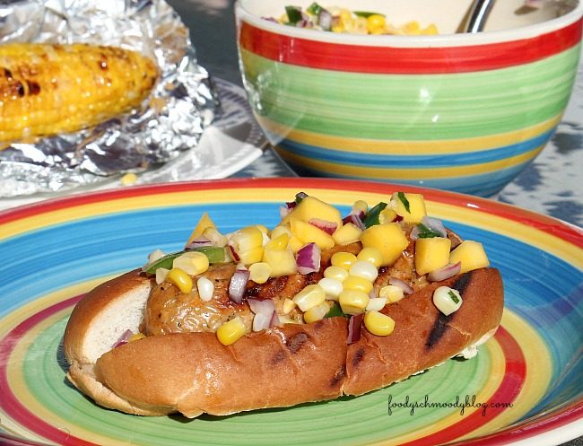 Since the kids weren't going to be eating the chicken sausages with us, I grilled them some hot dogs and instead of the relish, AKA salsa, I grilled them some Sunshine Sweet Corn to eat on the cob, simply with some butter and they devoured it!  I know you can grill the corn with the husks and all that but I never think to soak them ahead of time, so I had the kids "get their husk on" (or off, I should say), then I wrapped the corn in foil with a pat of butter and grilled it.  Again, super sweet.