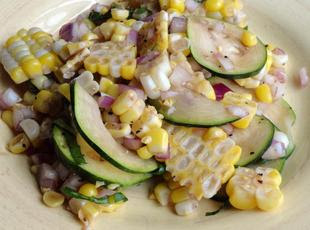 I tried to find some corn salad recipes, but to my surprise most of them were using cilantro and well, I didn't have cilantro on hand. I wanted to use up what I had left of last weeks CSA basket, which was corn, zucchini, onions and basil (so much basil).