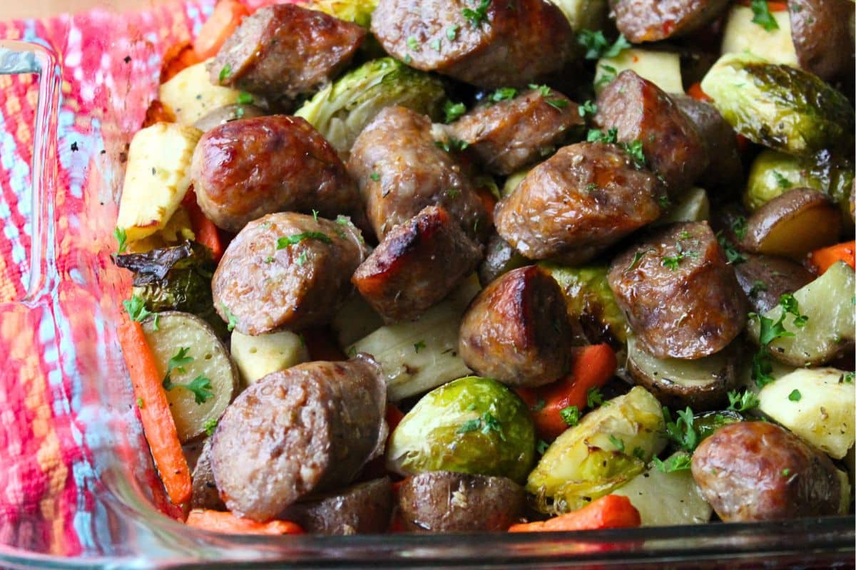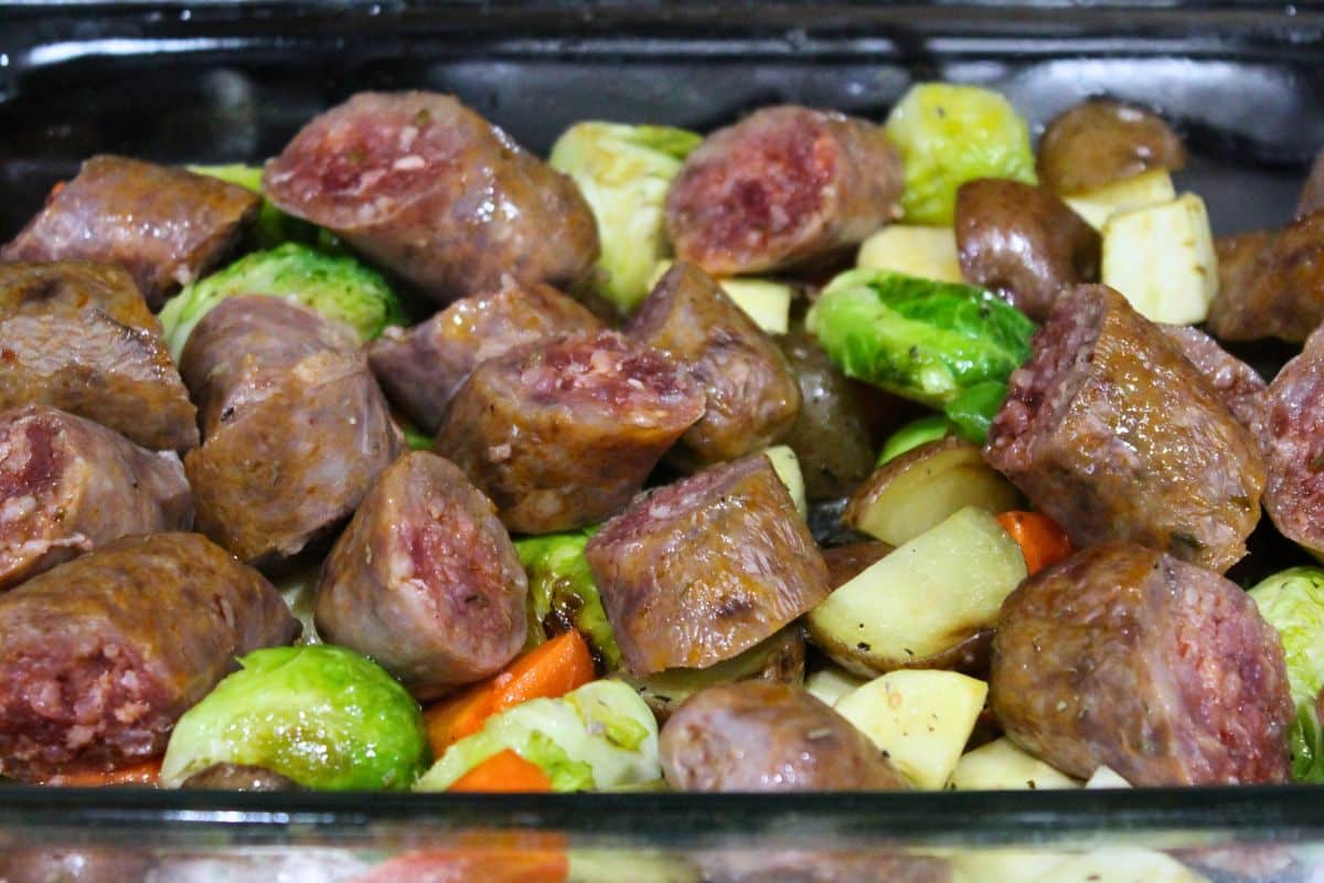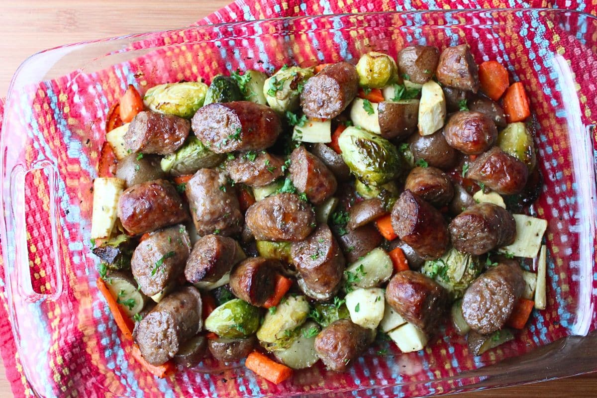 - After 25 minutes, remove the sausage from the oven, slice into bite sized pieces. Toss the vegetables with the dressing. Place the sliced sausage back on top of vegetables and return to oven and continue too cook 10-15 more minutes.
