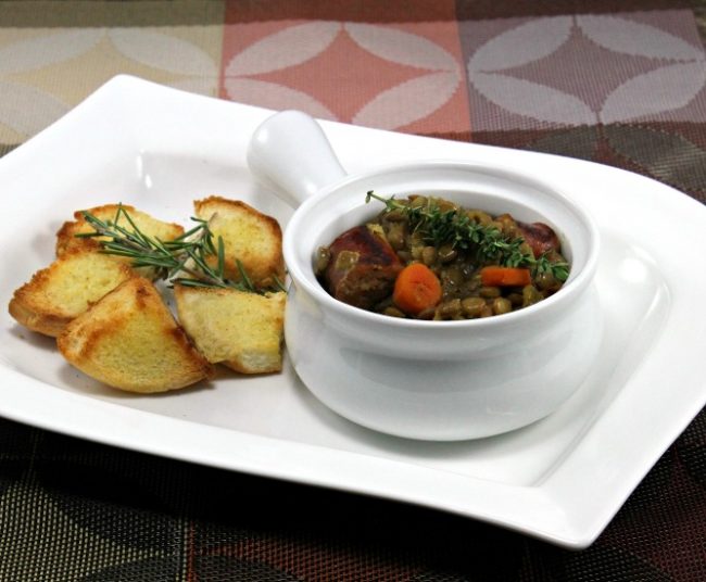 - Return pot to heat, add 1 T oil, onion and carrot. Season with salt and pepper. Cook 3-4 minutes. While vegetables are cooking, slice your sausage into bite sized pieces. After3-4 minutes, add garlic, herb bundle, sliced sausage and lentils to pot. Stir together and add broth. Bring just to a boil, cover with a tight fitting lid and place in oven for 1 hour.