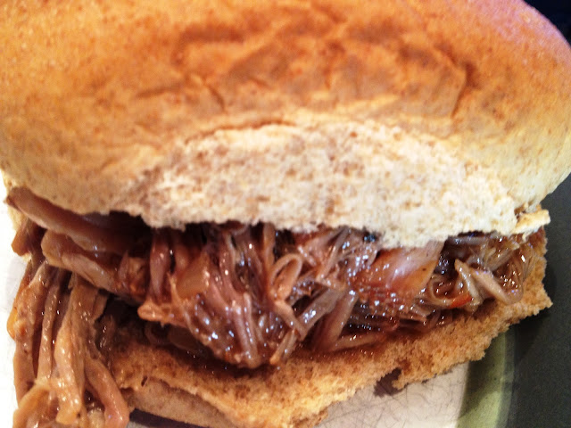 9. Add pork back to the crock pot and add bottle of your favorite BBQ sauce. Cook on high for another 45 minutes until sauce has thickened up a bit.