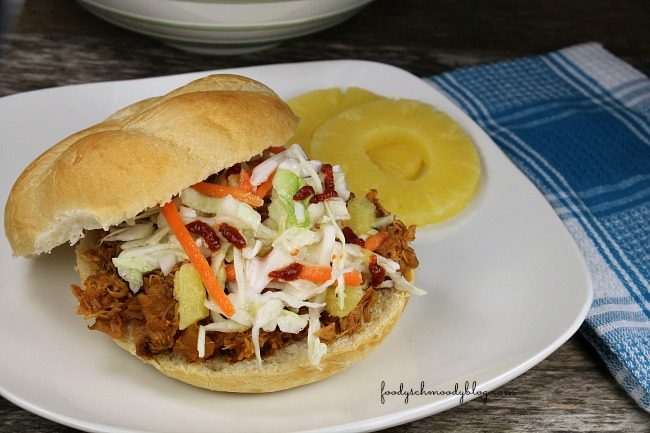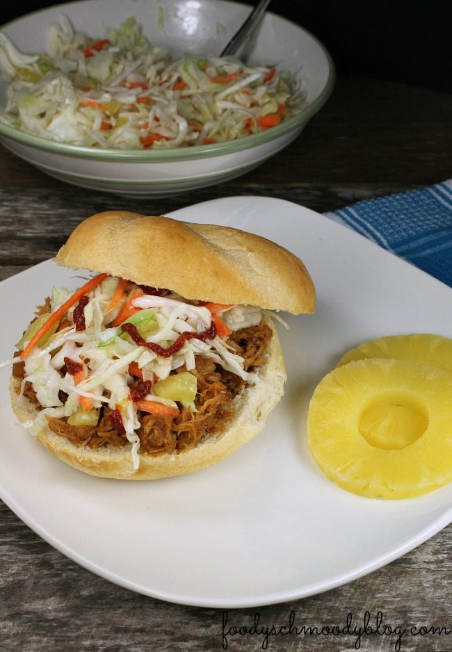 - Place desired amount on each sandwich roll, top with slaw and if desired add a slice of pineapple and or a little drizzle of sriracha.