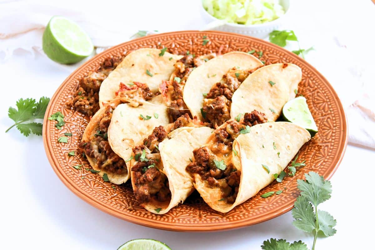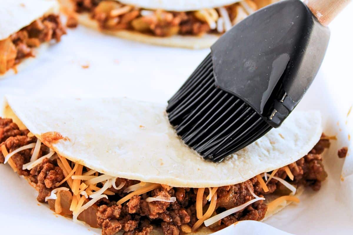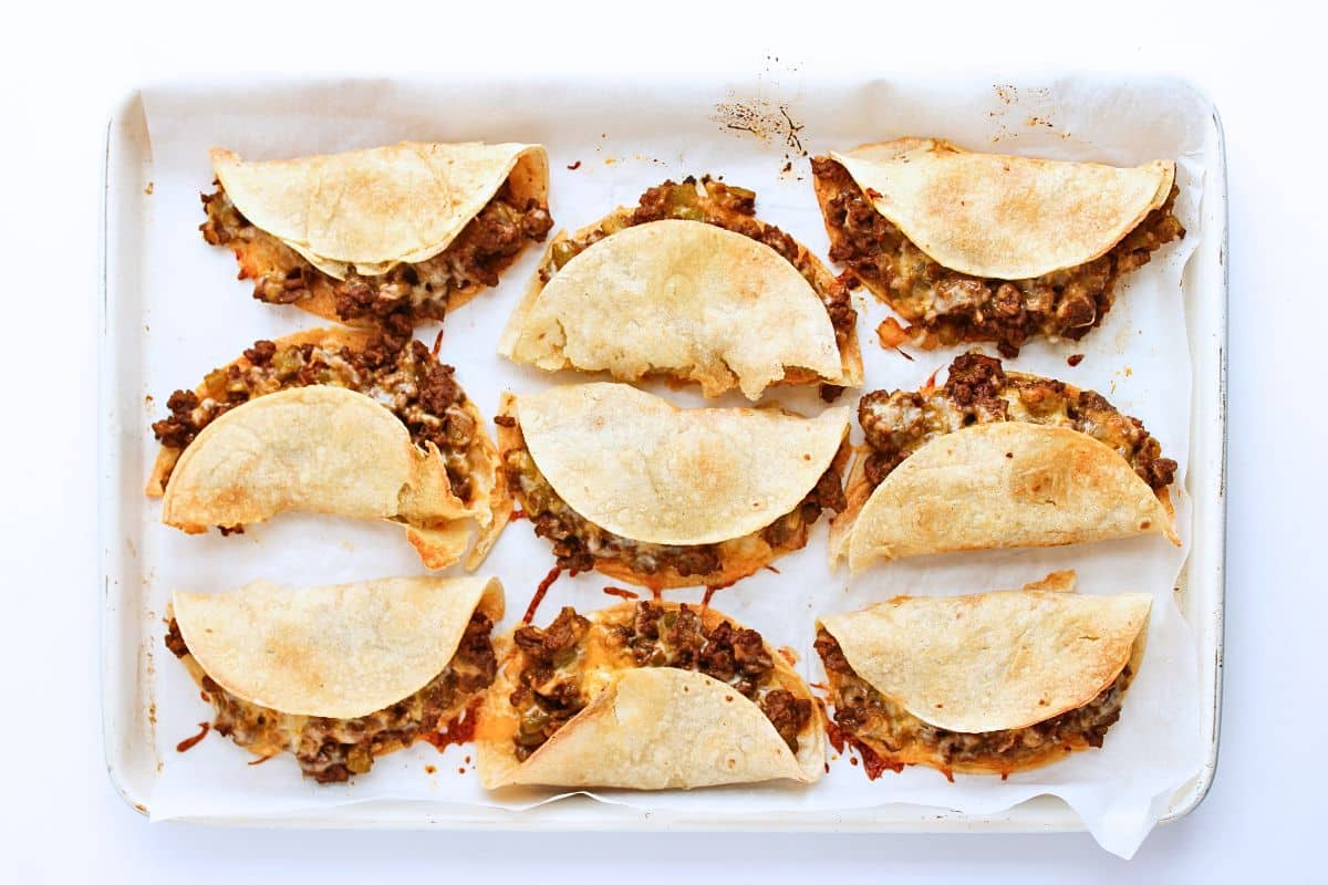 - Arrange tortillas flat on the prepared baking sheet. Spoon beef mixture onto one half of each tortilla, sprinkle with shredded cheese, then fold over. Lightly brush the tops of the tacos with the remaining oil.1 cup shredded cheese