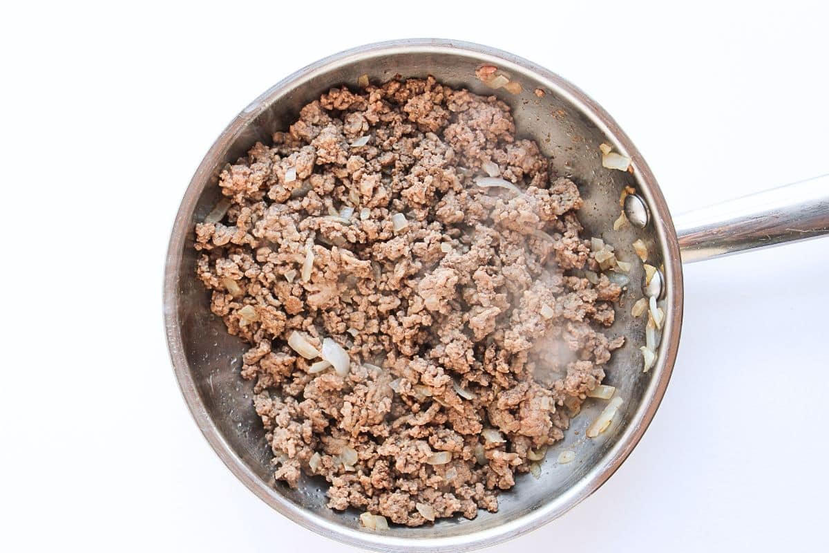 - Add the ground beef to the pan with the onions and cook, breaking it up with a spoon, until browned and fully cooked (about 5 to 10 min). SEE NOTE 41 pound lean ground beef