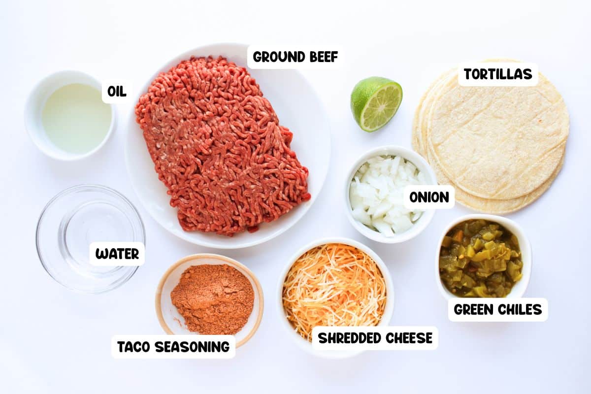 Simply cook the ground beef together with the onions, chiles and taco seasonings, stuff inside a tortilla with cheese and bake until crispy and melty! Yum!