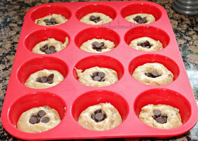 - Add just enough batter to each muffin well to cover the bottom (about ¼ of the way full). Add 4-5 chocolate chips to the center of each (more if you want extra chocolaty) and then top with more batter (enough to just about fill the well)