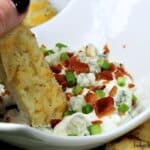 Garnish top of dip with green onion, remaining bacon and remaining blue cheese crumbles.
